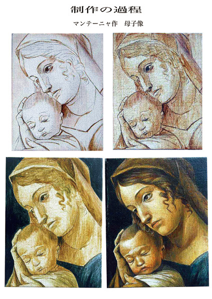 卵黄テンペラは古くはビザンチン ギリシャのイコン画から13世紀以降シエナ派 からフィレンツェルネサンスに至るまでの絵画作品を構成している重要な絵の具 (表現メディア)です。卵黄に少量の水を加えて色料(ピグメント)と混ぜ合わせた だけのシンプルでありながら純度の高い絵の具です。現代の絵の具に慣れた目 には新鮮に映ることでしょう。ここでは15世紀のマントバで活躍したマンテーニャ の名作聖母子像を手本に体験制作をしていただきます。0号の張りキャンバスで描きます。2回で完成出来ます。