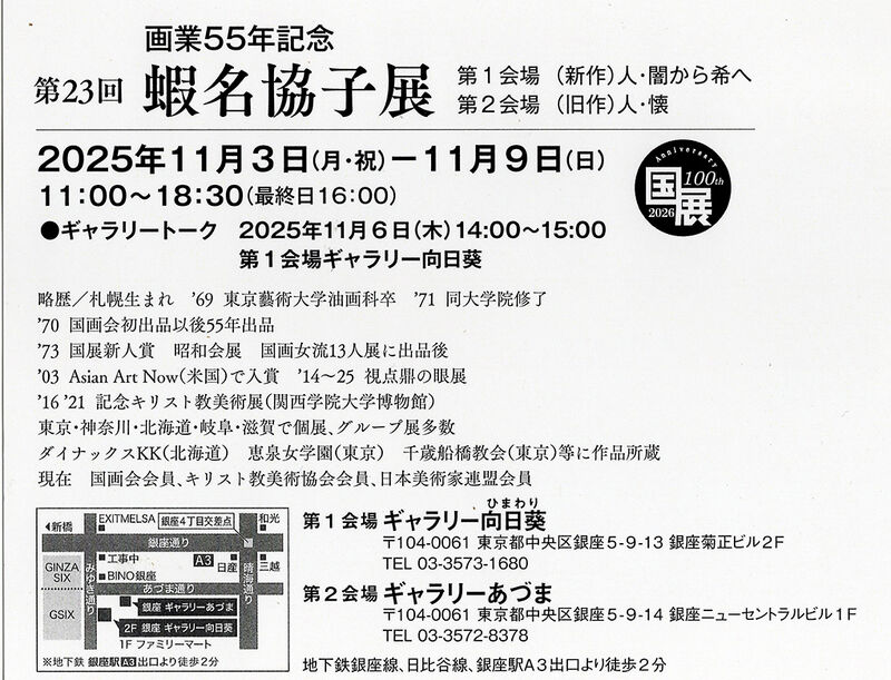 湘南美術アカデミーの大人のアトリエ教室を主宰する蝦名協子が画業55年記念として銀座で個展開催します。第1会場ギャラリー向日葵は新作で、第2会場ギャラリーあづまは旧作で展示します。季節の良くなる芸術の秋に銀座に絵画鑑賞にお越しください。